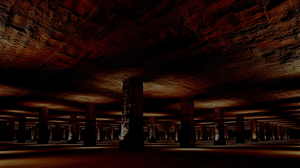 Beneath the cemetery, painstakingly carved from the red sandstone, lay an extensive, dimly lit cavern-like space, the twice-head-height ceiling supported by columns of stone. It looked more like a crude parking garage than anything else.